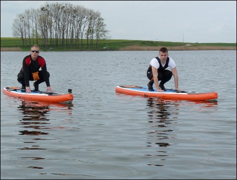 KROK 3: Chwyć leżące na desce wiosło i podeprzyj się nim z przodu.