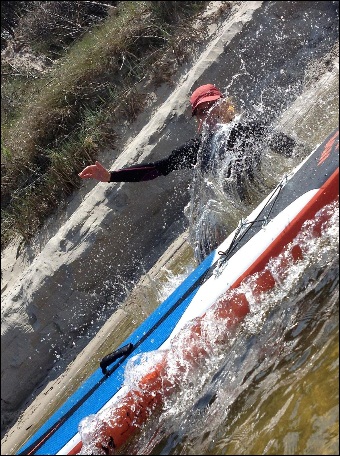 KROK 5: Wiosło wprowadź do wody od strony ręki trzymającej je w połowie, przeciągnij je w