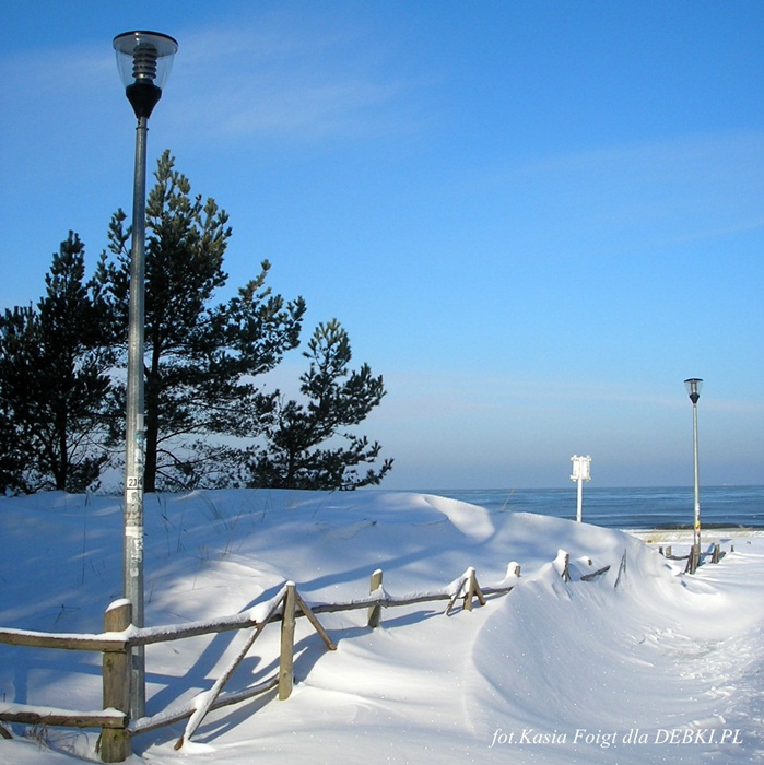Dębki zimą niczym bajkowa kraina, wejścia na plażę zasypane śniegiem.
